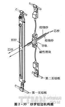 (1)機構的概要:這個裝置安裝在第一和第二頁綜框上。利用第一和第二頁綜框的上下運動帶動裝置工作,穿在織針上的兩根芯紗和穿過磁性滑塊上的一對斜長孔中的兩根絞纏紗,共四根紗羅紗進行絞邊,如圖2—33所示。