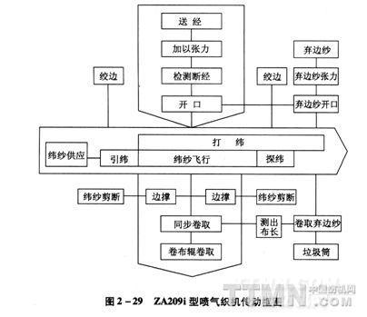 ZA200系列噴氣織機傳動系統:電動機通過三角帶將動力傳遞給織機主軸,主軸再傳遞給織機上的各個機構。織機在點動和自動尋緯期間的運動是通過5 Hz變頻電源驅動主電動機,然后主電動機再將動力傳遞給織機各個機構。