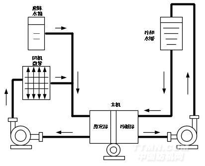 圖1所示為一典型中央空調(diào)機組系統(tǒng)圖,主要由冷凍水循環(huán)系統(tǒng)、冷卻水循環(huán)系統(tǒng)及主機三部分組成: