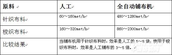 產(chǎn)量大 人工鋪布,4個人一天能鋪約800層;全自動鋪布機一個人操作能完成1000層以上。工作效率是人手的4倍-6倍以上。