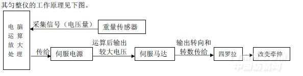 采用進口THD?901AL自調勻整器,對棉條實行在線勻整控制,該套勻整系統屬于開環控制短片段勻整儀,它控制的是初牽伸,也就是通過改變第四羅拉速度來不斷調整牽伸倍數,從而達到輸出棉條符合重量要求,第四羅拉與普通并條機有所不同,它是左右分開單獨由伺服電機控制傳動的。其勻整儀的工作原理見下圖。