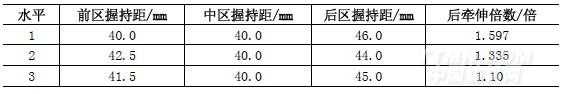 經試驗最終確定的工藝參數為前區握持距為40mm,中區握持距為40mm,后區握持距為44mm,后區牽伸倍數為1.335倍。