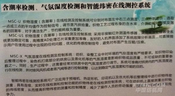 在2013年10月15日中國印染行業(yè)協(xié)會第五屆理事會期間。常州宏大展示了其新推出MSC-U織物濕度含潮率在線測控系統(tǒng)、MSC-X氣氛適度在線測控系統(tǒng)、智能緯密在線測控系統(tǒng)。一系列印染自動化、智能化、信息化先進系統(tǒng)。