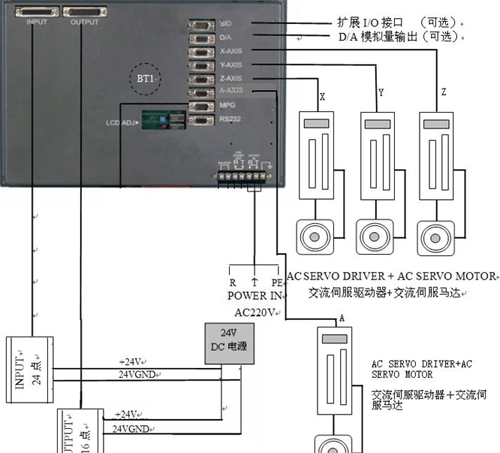 點膠機設備需要四個軸控制即X、Y(2個)、Z,但是X和Y(2個)要進行插補運行,而插補運行時在G代碼的加工軟件指令中只有X和Y、X和Z、Y和Z,要與CAD等圖形編輯軟件生成的G代碼程序通用就不能使用2個Y軸;因此我們解決的方式是使用中達電通的四軸數控系統(PUTNC-H4-4):X軸控制原來的X軸在橫向運動;Y軸控制原來的Y1軸,同橫向的X軸進行插補控制第一個點膠平臺;Z軸控制原來的Y2軸,同橫向的X軸進行插補控制第二個點膠平臺;A軸控制原來的Z軸走不同高度的點膠面;這樣就可以解決控制系統能直接執行CAD等圖形編輯軟件生成的代碼程序;中達的數控系統本身具有24個輸入點、16個輸出點,設備的I/O點也夠使用;中達的A系列伺服使用的控制理論是最先進的強健式的控制理論(PDFF),即使在伺服電機的負載慣量大范圍的變化時,伺服系統仍然可以保持優異的性能,進行流暢、精準、正確地定位。通過客戶的技術要求和原控制方案的不足我們選擇了基于中達電通的數控系統的控制方案,系統由數控系統、伺服控制系統、執行機構組成控制方案,參見圖1。系統電氣接線參見圖2。電控柜圖片參見圖3。