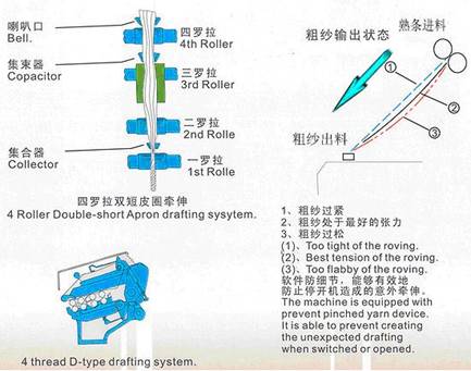 5 .羅拉裝置(其牽伸原理如圖3) 6 .錠翼裝置 7 .卷繞裝置