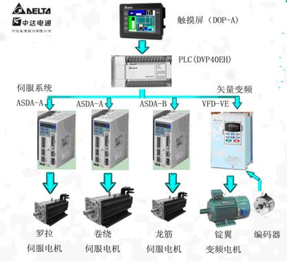 基于設備的以上技術特征和客戶高品質要求,結合臺達完整、全面的產品線,我們選用臺達EH2系列PLC作為主控,選用臺達VE系列高性能矢量變頻器控制錠翼軸;臺達A+系列大功率伺服系統控制卷繞軸;羅拉軸和龍筋軸分別選用臺達AB系列伺服系統控制;觸摸屏為臺達A系列真彩界面。