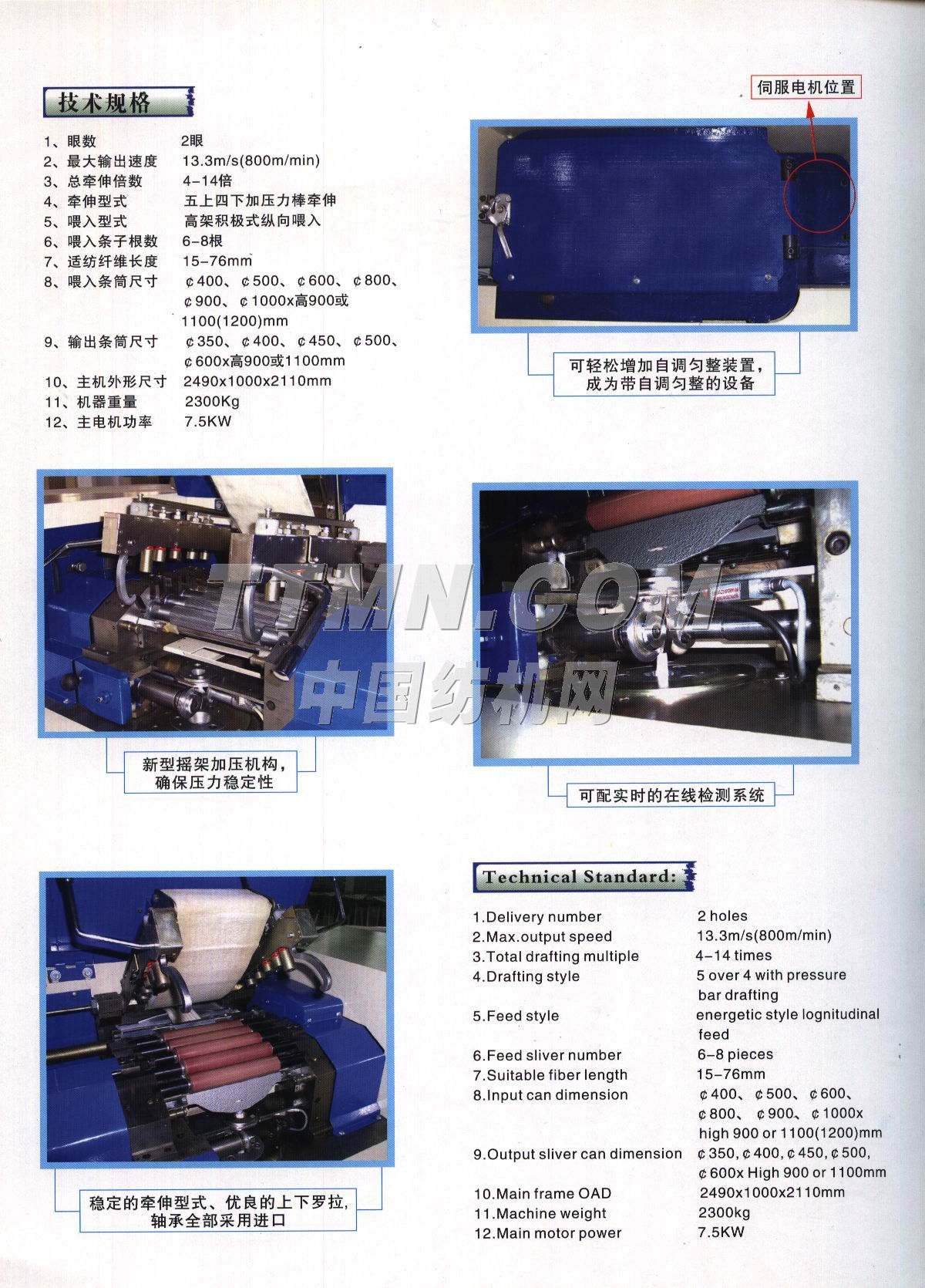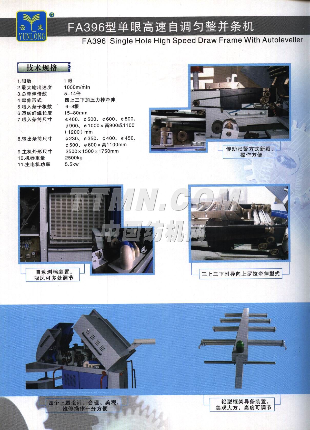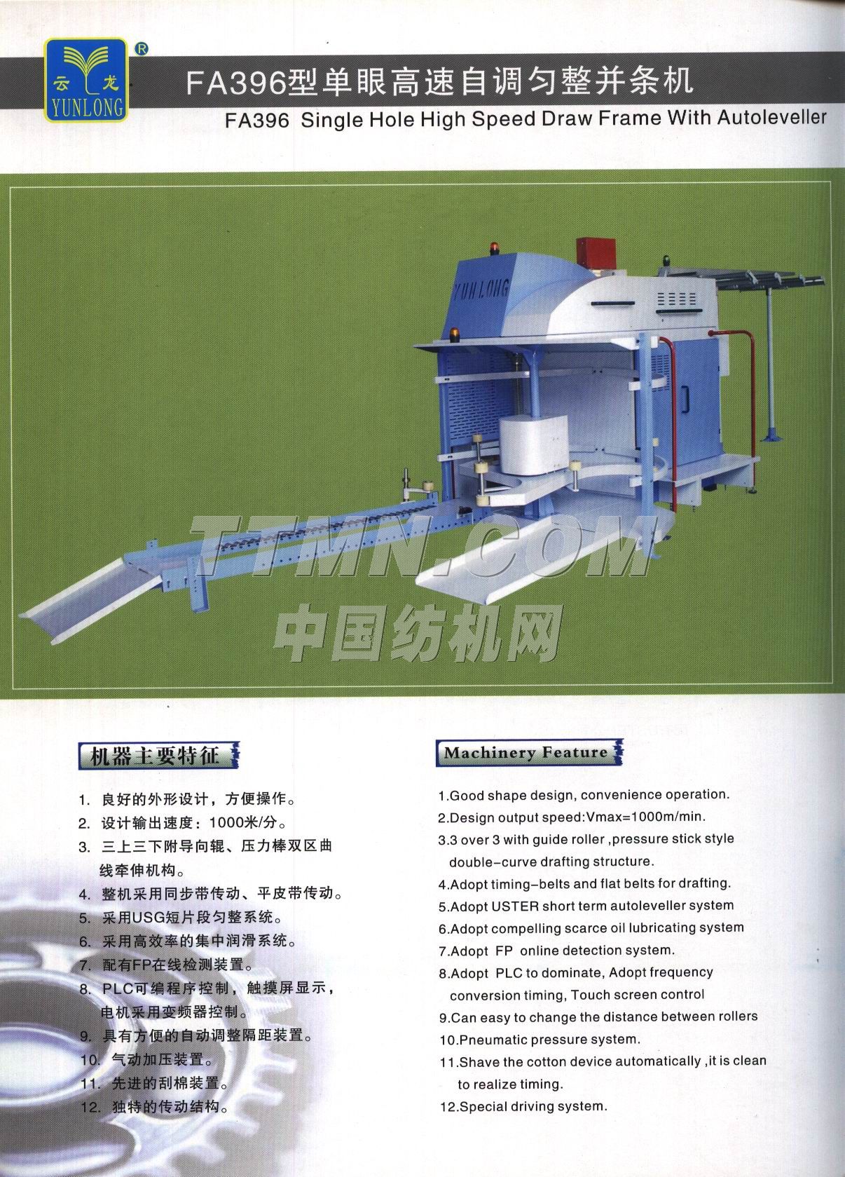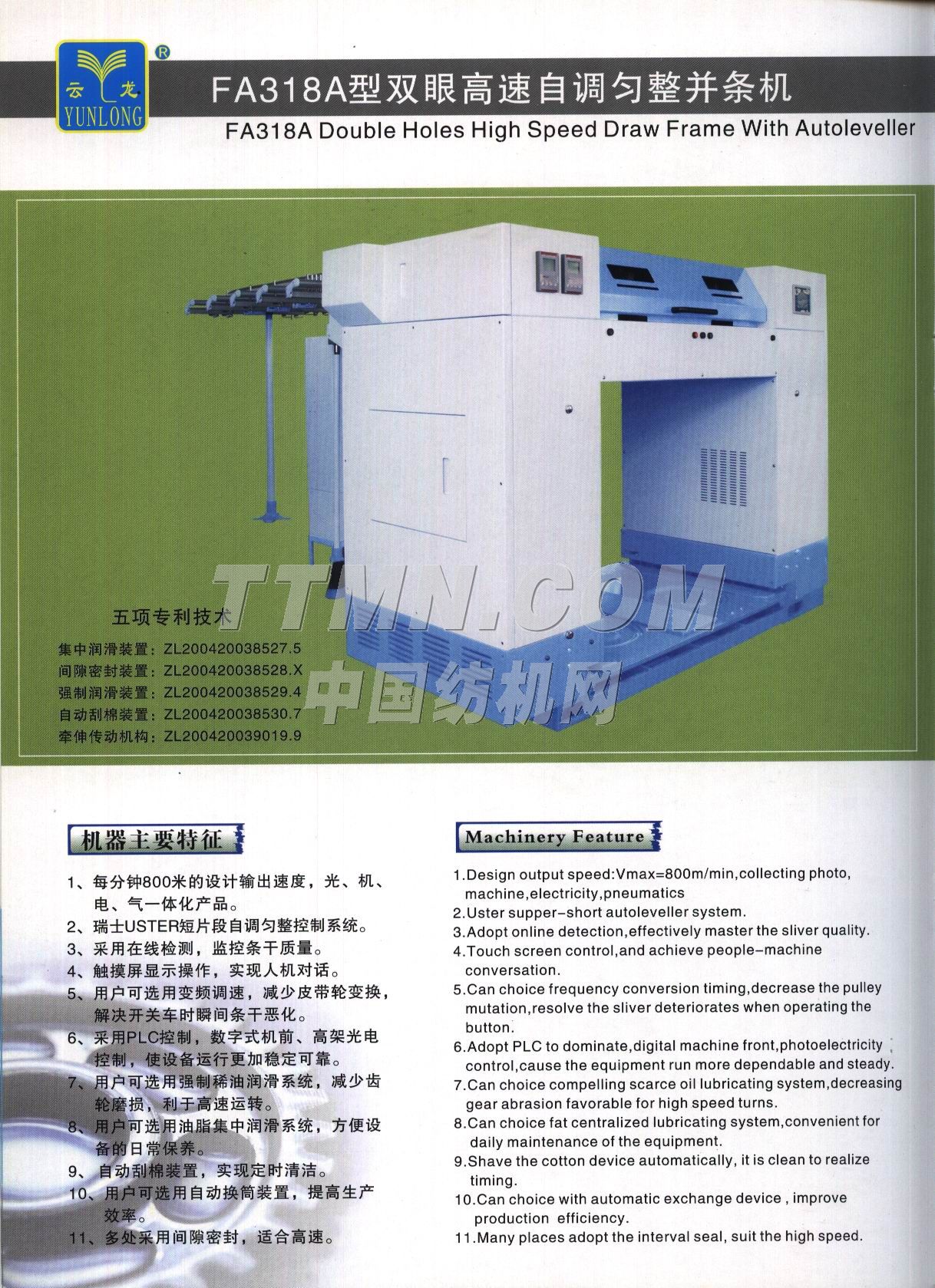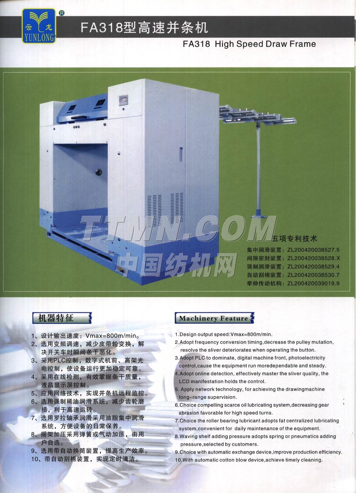 青島云龍紡織機械有限公司生產的“云龍”牌并條機有FA387、FA316、FA318、FA318A、FA396、FC300、 FA304A、FB400型八大系列,其中FA387采用數字化控制牽伸倍數,方便快捷,FA318獲得國家重點新產品,FA318A、FA396被山東省評為省科技進步一等獎、中國紡織協會二等獎。FA387、FA318A、FA396并條機達到國際先進水平。FC300型并條機適紡長纖維。規格品種齊全,設計先進,性能穩定、傳動合理。青島即墨第一紡織機械廠生產的“銀龍... |