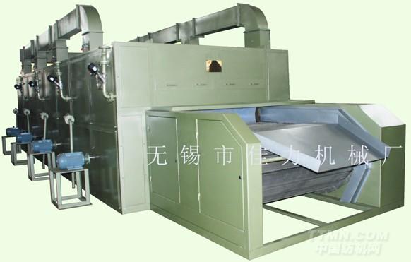 該機有機架、風扇、運毛簾、加熱器等組合而成,機架系由槽鋼、角鋼等組成,分成主室與側室兩部分,用鋼板隔離,主室安裝輸送簾板、加熱器及隔風板等,側室安裝風機、風導、調速電機及減速器。為防止熱量散失,四周板壁中裝有隔熱材料,主室裝有可坼卸的多塊小門板便于維修。各式頂部有兩個開口排氣孔,把它們連在一起把濕空氣排出機外,每個接口處裝有活動調節裝置,以調節排濕量。(據客戶要求,也可以安裝排濕風機,進行對外排出濕空氣。)