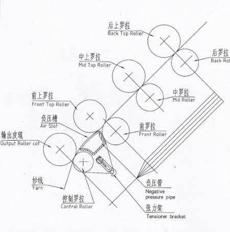 我公司研發的緊密紡裝置采用網格圈積極傳動結構,主要由異型管(又稱負壓管)、網格圈及其張緊裝置、輸出羅拉、帶齒前羅拉、過橋齒輪及其附件、輸出上羅拉(皮輥)、皮輥架、羅拉座以及緊密紡負壓系統等零部件組成。其中,帶齒輸出羅拉安裝在異型管內,帶齒前羅拉輸出的動力用過過橋齒輪傳動給帶齒輸出羅拉。網格圈在帶齒輸出羅拉和輸出皮輥的作用下積極傳動,異型管負壓由安裝在車尾的緊密紡風機經總風管提供。針對國內細紗機的結構特點,本裝置采用六錠為一個單元的模塊化設計,不論老機改造還是新機配套都能勝任。該紡紗技術主要通過負壓氣流的作用將纖維收攏、集聚,使須條邊緣上的纖維快速有效的向須條中心集聚并伸直,最終最大限度地減小紡紗三角區,從而大幅度減少突出于紗線本體外的毛羽,提高纖維的強力利用率,成紗強力得以提升。