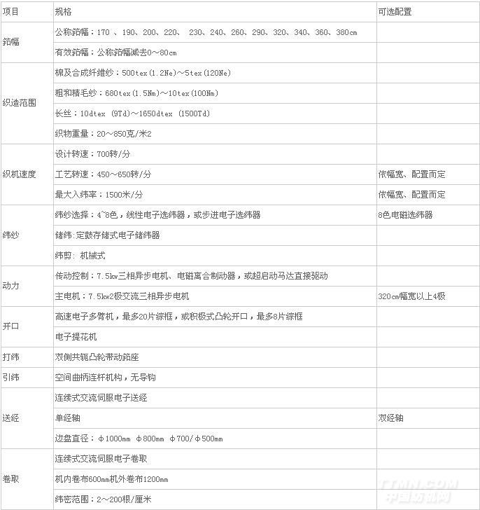 ★ 織機設計轉速700轉/分,最大入緯率1500米/分;筘幅范圍達170~380cm;可選配置方案多,能充分滿足各種不同品種織物的需要。