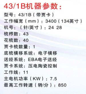 43/1B 花邊機采用國內(nèi)最先進的賈卡和鋼絲多梳結(jié)構(gòu)。使得花邊面料質(zhì)量更加穩(wěn)定可靠,且產(chǎn)量高,操作方便,更換花型簡單。花梳采用獨特的單卡控制補償程序,確保了花梳運行的高精確度。是同類產(chǎn)品中性價比最高、且深受用戶喜愛。