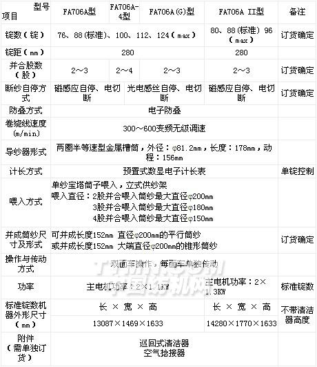 FA706系列高速并紗機(jī)(中國紡織總會頒發(fā)的產(chǎn)品型號)是將棉、毛、化纖及混紡紗的兩股、三股或四股合為一股用于捻線或倍捻的紡織設(shè)備。其精良的制造、獨(dú)具一格的設(shè)計(jì)獲得多項(xiàng)國家專利,達(dá)到國際同類產(chǎn)品的先進(jìn)水平。