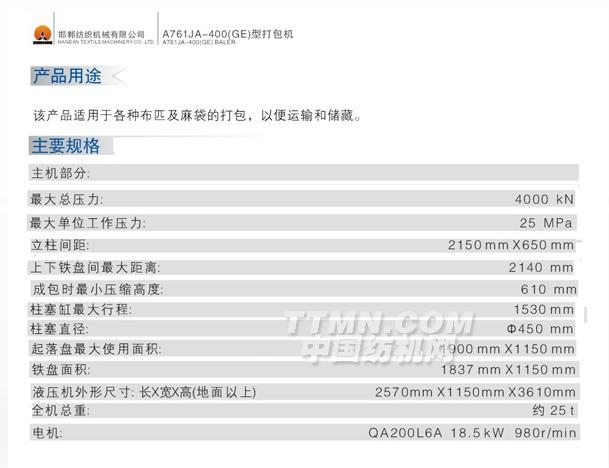 您所在的位置:紡機網 > 產品庫 > A761JA—400(GE)型打包機