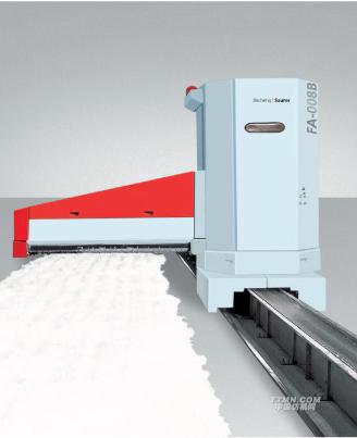 本機為往復式自動抓棉機,適用于抓取各種等級的原棉、棉型化纖及76mm以下的中長纖維,是開清棉聯合機組的第一道機臺。智能化的運行小車,能對雙品種原棉分別實行精細抓棉,被抓取的棉束被氣流輸送至后方機臺作進一步處理。