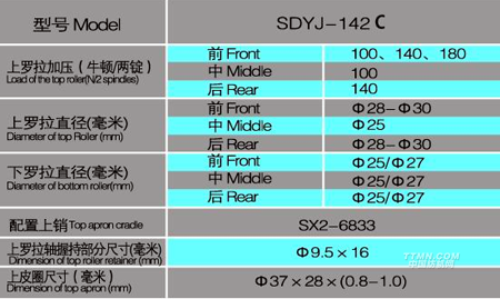 SDYJ2-142C型搖架適用于各型環錠紡細紗機,采用三羅拉雙皮圈平面牽伸形式,適應于纖維長度60毫米以下的純棉、 人造纖維及其合成纖維。采用單區牽伸形式時,可紡纖維長度120毫米。