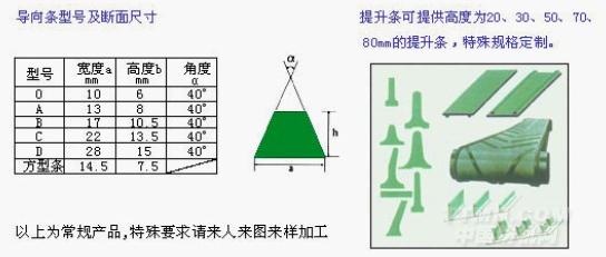 1 、提升帶、轉彎帶、導向帶、裙邊帶為來樣來圖定制,提升條可供高度為 1cm 、 3cm 、 5cm 、