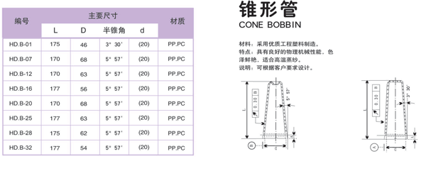我公司生產的錐形管,均采用優質工程塑料制造,具有表面光潔、線槽清晰的特點,并具有良好的物理機械性能,色澤鮮艷,適合高溫蒸紗,且可根據客戶要求設計生產。