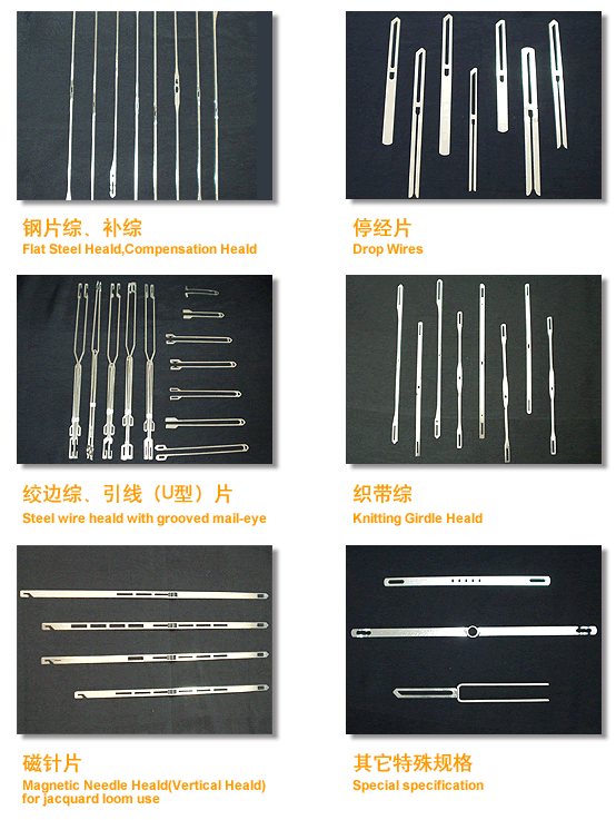 公司主導產品為各種規格的鋼片綜、織帶綜、絞邊綜、磁針片和停經片等,廣泛應用于各類進口和國產的劍桿機,噴水、噴氣、片梭織機、無梭織帶機和電子提花龍頭等,本公司針對客戶的不同需求,開發了合金鋼和特殊不銹鋼材質的兩大系列產品。