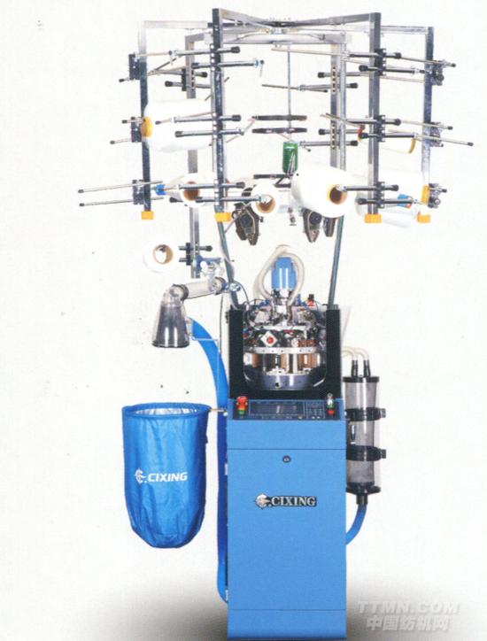 “慈星”牌GE04P型電腦高速絲襪機是由電腦控制的具有四路編織系統的單針筒平紋絲襪機。該機采用獨立抽風機或中央抽風系統進行織物牽拉,并配備抗扭裝置。針筒轉動采用伺服電機直接驅動以減少傳動鏈的傳動誤差。生克三角的位置調節和針筒升降由步進電機控制,便于產生不同疏密織物。潤滑系統采用機械式供油,同步潤滑控制溫升。該機可使用合成纖維、人造纖維以及裸氨綸和包覆紗等原料生產絲襪產品,包括連褲襪、長絲襪、短絲襪、九分襪褲等多種絲襪產品。