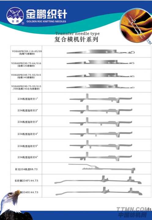 復(fù)合橫機(jī)針則包括VOSASPEC89.118-85/09(島精7G移圈針)、VOSASPEC89.75-64/016(島精12G移圈針)、VOSASPEC89.75-55/015(島精14G移圈針)、VOSASPEC89.75-55/015/SH(島精14G小勾移圈針)、234機(jī)型選針片1’至6’、針叉234機(jī)型88.73、長針腳234F144.73及長針腳234S144.73共13種復(fù)合橫機(jī)針。
