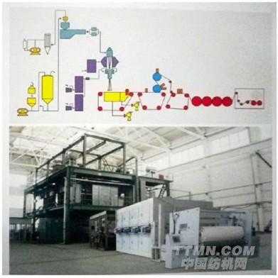 據悉,在展會上展出的紡粘水刺生產線的紡絲和拉伸部分引進美國希爾斯(Hills)公司較為成熟的橘瓣型雙組分復合紡絲工藝和設備,拉伸部分采用希爾公司的整板正壓裝置,水刺部分配恒天重工的生產線。橘瓣為16瓣分裂型,生產線門幅為1.6m。紡粘水刺生產線流程及設備見圖