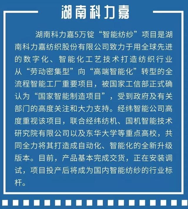 三個棉紡成套項目均選用了經緯智能公司JWF1566智能升級型細紗機,并配套了公司羅拉、錠子專件產品。JWF1213型寬幅梳棉機被阿克蘇聯發、四川蘆山湘鄰同時選用,JWF1458A型自動落紗粗紗機、JWF9562C型粗細聯輸送系統、JWF1313型雙眼大條筒并條機、JWF1316系列勻整并條機同時被湖南科力嘉、四川蘆山湘鄰選用。此外,湖南科力嘉還選用了JWF1278A型精梳機、JWG0121型筒紗自動輸送包裝系統、JWF1203型梳棉機和搖架,四川蘆山湘鄰還選用了VCRO-I細絡聯型自動絡筒機。這些產品均是公司“智能化、數字化、高效節能”的成熟機型。