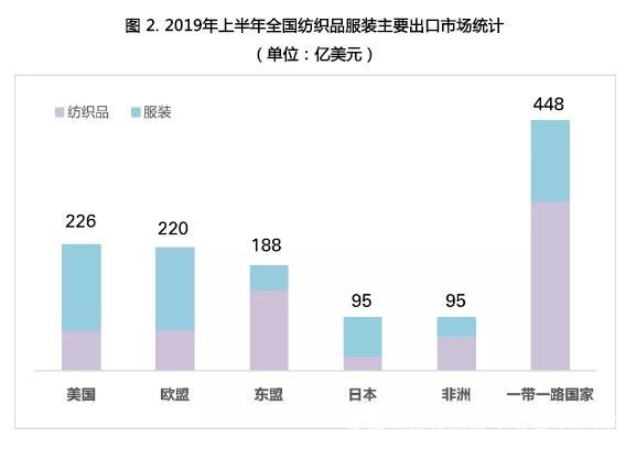 盡管今年5月份以來中美貿易摩擦局勢有所升級,但從上半年行業出口表現看,我國紡織品服裝最主要的出口市場仍是美國。1-6月份,我紡織品服裝對美累計出口額為226.2億美元,同比下降0.66%,受加征關稅影響,我國對美出口紡織品72.9億美元,同比下降2.24%,由于服裝產品暫未被列入現行的加稅清單中,上半年出口金額為153.3億美元,微增0.11%。