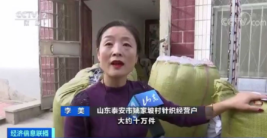山東泰安市姚家坡村針織經營戶李美:每次訂單都是一集裝箱,大約十萬件。