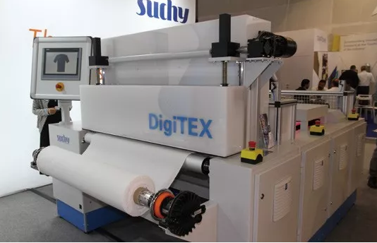 德國suchy公司推了一款名為DigiTEX的數碼整理設備,目前還處于測試完善階段。該機采用電腦控制,最高運行速度可達100m/min,在60m/min的線速度下每平米織物上可施加120g的化學品。噴射系統采用按需噴射模式,噴頭允許的工作液類型包括水性、UV和溶劑型,黏度范圍10~50mPa·s,pH值5~10,烘干單元可選擇紅外、UV或熱風烘干。