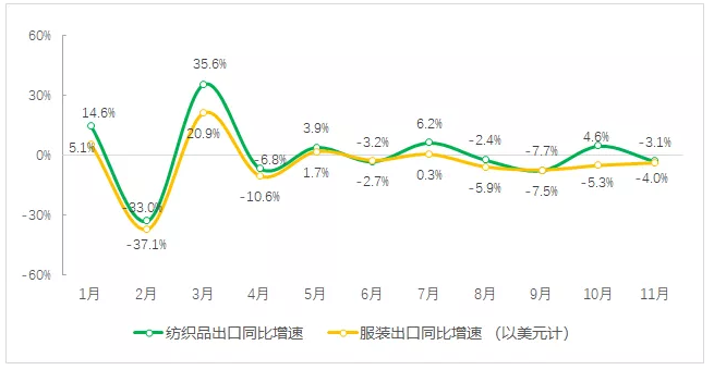 圖1.2019年全國紡織品、服裝出口額月度同比增速