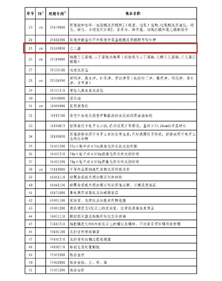 昨日,國務院發布稅委會公告〔2020〕4號文件《國務院關稅稅則委員會關于第二批對美加征關稅商品第二次排除清單的公告》,錦綸66主要原料己二腈在排除清單內。原文如下: