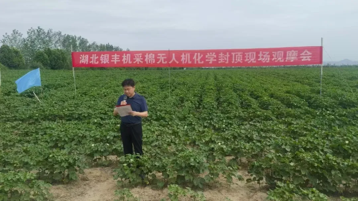 8月10日上午,雖已立秋,氣溫仍達36度。湖北銀豐棉花股份有限公司(簡稱銀豐公司)在荊門市屈家嶺管理區吳家巷舉辦了機采棉無人機化學封頂現場觀摩會。國家工程院院士、我國著名的棉花育種專家張獻龍教授到現場觀看并提出指導性意見。