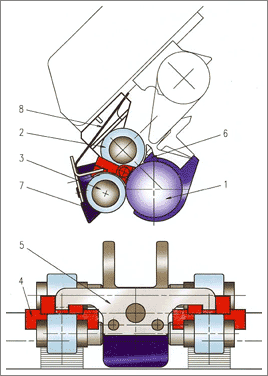 RoCoS裝置包括下羅拉1,前皮輥2,引紗皮輥3,精確的底部和裝有SUPRA磁鐵的陶瓷緊密器4,支撐梁5,導紗器6,上羅拉支架7,加壓彈簧8