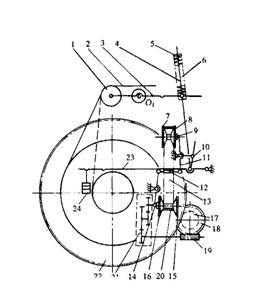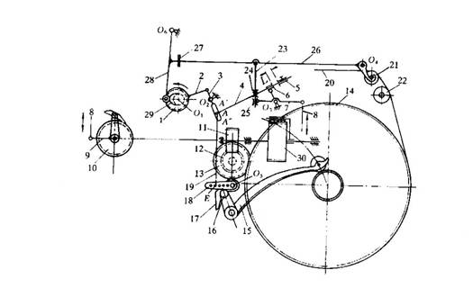 1-偏心盤(pán)? 2-外殼? 3-擺桿? 4-拉桿? 5-擋圈? 6-擋塊? 7-三臂桿? 8-小拉桿? 9-雙臂撐桿? 10-棘輪? 11-蝸桿? 12-蝸輪? 13-齒輪? 14-織軸邊盤(pán)齒輪? 15-轉(zhuǎn)臂? 16-轉(zhuǎn)子? 17-雙曲線凸輪板? 18-調(diào)節(jié)轉(zhuǎn)臂19-連桿? 20-經(jīng)紗? 21-活動(dòng)后粱? 22-固定后粱? 23-調(diào)節(jié)桿? 24-擋圈? 25-擋塊? 26-扇形張力桿? 27-制動(dòng)器? 28-制動(dòng)桿? 29-開(kāi)放凸輪