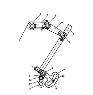7-連桿? 8-經(jīng)紗? 9-固定后梁? 10-彈簧桿? 11-阻尼器? 12-彈簧? 13-雙臂桿