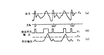 圖10-16表示了經(jīng)紗張力采集、處理和控制原理。當(dāng)經(jīng)紗張力大于預(yù)定數(shù)值F0時(shí),見(jiàn)圖10-17(a)中虛線所示,鐵片對(duì)接近開(kāi)關(guān)的遮蓋程度達(dá)到使振蕩回路停振,于是開(kāi)關(guān)電路輸出信號(hào)V1,見(jiàn)圖10-17(b)所示。F0的數(shù)值由調(diào)整張力彈簧剛度和接近開(kāi)關(guān)安裝位置來(lái)設(shè)定。信號(hào)V1經(jīng)積分電路、比較電路處理,如圖10-17(c)所示。當(dāng)積分電壓V2高于設(shè)定電壓V0,則輸出信號(hào)(V2-V0)通過(guò)驅(qū)動(dòng)電路使直流送經(jīng)伺服電動(dòng)機(jī)轉(zhuǎn)動(dòng),織軸放出經(jīng)紗。輸出信號(hào)(V2-V0)越大,電動(dòng)機(jī)轉(zhuǎn)速越高,經(jīng)紗放出速度越快。當(dāng)V2<V0時(shí),電動(dòng)機(jī)不轉(zhuǎn)動(dòng),織軸被鎖定,經(jīng)紗不能放出。