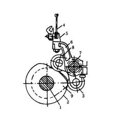 1-主軸? 2-凸輪? 3-轉(zhuǎn)子? 4-鋼筘? 5-筘夾? 6-筘座腳? 7-搖軸? 8-轉(zhuǎn)子? 9-凸輪
