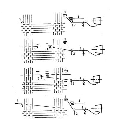 這兩種型式相比,單劍桿引緯時,緯紗不經歷梭口中央的交接過程,故較可靠,劍頭結構簡單,但劍桿尺寸大,增加占地面積,且劍桿動程大,限制車速的提高。而雙劍桿引緯時,劍桿輕巧,結構緊湊,便于達到寬幅和高速,梭口中央的緯紗交接現已很
