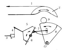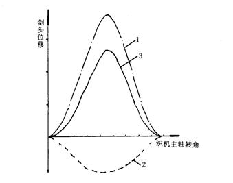 1-僅由引緯連桿機構運動引起的劍桿位移? 2-僅由筘座運動引起的劍桿位移