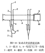 圖7-23為復動式單花筒提花開口示意圖,相間排列的兩組提刀1、2,分別裝在兩只刀架上。織機主軸回轉兩轉,兩組提刀交替升降一次,控制相應的豎鉤3、4升降。豎鉤的數目是相同容量單動式提花開口機構的兩倍。每根通絲7由兩根豎鉤通過首線5、6控制,而這兩根豎鉤受同一根橫針8的控制。因此,兩只刀架的上升都可使通絲獲得上升運動,并能連續上升任何次數。如上次開口豎鉤3上升,豎鉤4在下方維持不動,則豎鉤3下方的首線和全部通絲將隨著豎鉤3上升;若下次開口中這組通絲仍需上升,則豎鉤3下降而豎鉤4上升,約在平綜位置相遇,繼續運動時首線和通絲即隨豎鉤4再次上升,豎鉤3下面的首線將呈松弛狀態,所以形成的是半開梭口。