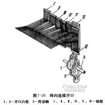 在前述的單動式和復動式單花筒多臂開口機構中,拉刀在開始移動一段距離之后才與拉鉤接觸,于是接觸產生拉刀與拉鉤間的沖擊,引起動作失誤、機件磨損。為了消除這一現象,拉刀開始移動之前作微量的自轉,在與拉鉤嚙合之后再作共同移動,這自轉是由凸輪軸兩端的溝槽凸輪來控制的。拉鉤運動結束后,溝槽凸輪通過連桿使拉刀微量倒轉以恢復原來的初始位置。