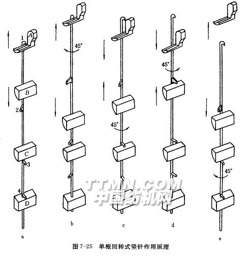 的下提刀B垂直而破再次提起。圖7-25(e)表示豎針隨下鉤2下降,豎針順時針方向轉過45º,底鉤4停在底板D上。