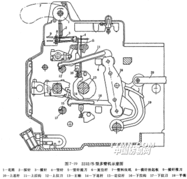 多臂開口機構如圖7-19所示,它屬于積極復動式全開梭口的高速多臂機,由提綜、選綜和自動找緯三部分組成。