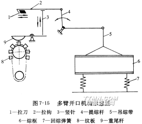 按提綜裝置的結構不同,多臂開口機構又可分成拉刀拉鉤式和回轉式兩類。前者歷史悠久,但機構復雜,較難適應高速運轉;后者采用回轉偏心盤原理,機構簡單,適合高速。