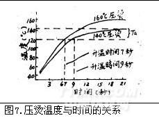 壓燙時間與溫度是相關的,提高壓燙溫度可縮短升溫時間,使熱熔膠在較短時間內(nèi)達到膠粘溫度ta。圖7表示膠粘溫度為120~140℃的襯布在不同壓燙溫度時溫度與時間關系。因此在選擇壓燙條件時,我們應根據(jù)面料、襯布和壓燙進行綜合考慮。例如:面料熱收縮較大時則壓燙的溫度可略低些,而壓燙時間適當延長,相反情況也一樣。
