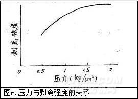 隨著壓燙壓力增加,粘合剝離強度也相應提高。但其影響不如溫度的影響明顯,并且壓力達到一定值后對剝離強度不再有影響。壓力與剝離強度的關系如圖6所示。