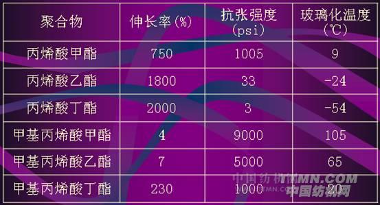 該類粘合劑是一個以碳單鍵為主鏈的高分子化合物。它們的許多性質取決于側基中的R1和R2。若R1為-H,即為聚丙烯酸酯衍生物;若R1為-CH3,即為聚甲基丙烯酸酯衍生物。一般來說,聚合物的玻璃化溫度Tg較低,其柔順性較好。由于空間位阻效應,甲基丙烯酸酯及其衍生物的Tg值較高,其性質也較為剛硬。R2中碳直鏈越長,其非極性側基的柔順性越好,則大分子的柔軟性及撓曲性越好,Tg值也越低。因此分析這類物質的性質時,關鍵在于掌握R1及R2的結構特點。