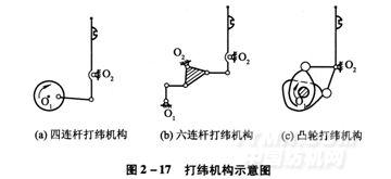 通常打緯機構有四連桿打緯,六連桿打緯和共軛凸輪打緯三種類型,圖2一17為三種機構的示意圖。