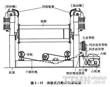 在圖2—15中,當凸輪由小半徑轉到大半徑時,通過轉子和開口臂將連接在綜框上的鋼絲繩向右拉動使綜框從最高點運動到最低點;同時回綜彈簧受力伸長儲蓄能量。當開口凸輪繼續轉動從大半徑轉向小半徑時,整個回綜系統則靠回綜彈簧儲蓄的能量使綜框回復到原位,即從最低到最高。