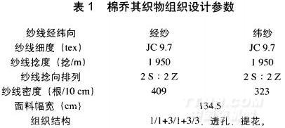 紗線的捻度、捻向和織物的強(qiáng)度、手感、外觀密切相關(guān)。為使印染整理后面料手感舒爽,有隱約的縐縮紋效果,在設(shè)E借鑒絲織喬其縐的設(shè)計(jì)思路,經(jīng)緯紗采用Jc9.7tex(捻度1950捻/m)強(qiáng)捻紗,并按2S:2Z排列,這樣在退、練、漂后由于強(qiáng)捻紗的退捻收縮產(chǎn)生皺縮效果,且相鄰兩種捻向的紗退捻方向相反產(chǎn)生相互作用力,使布面縐紋均勻細(xì)密,具有精細(xì)的外觀,并且給人舒適自然的感覺。